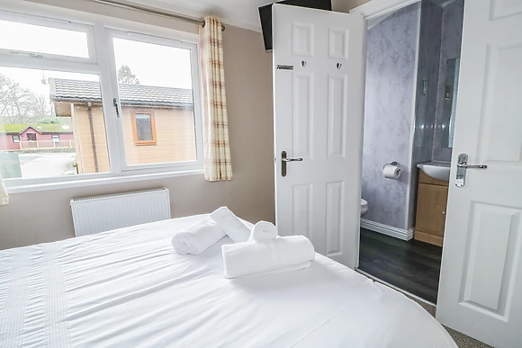 The open plan living area exudes quality and style, with a well-equipped kitchen, a dining area and a sitting area with flat screen TV and French doors leading to the front decked area, complete with an indulgent bubbling hot tub. The lake shore is only a few hundred yards and has a jetty where boats are moored.