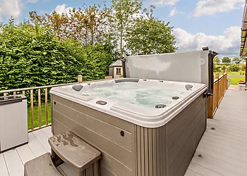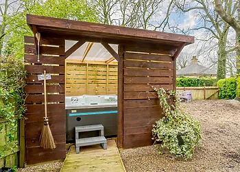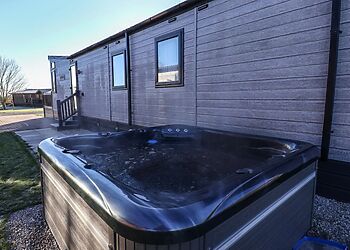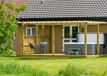 The balcony provides an ideal spot to sit and relax in the superb hot tub on a warm summer's evening. There are extensive lawns surrounding this Stamford Bridge log cabin, which lead to a shared fishing pond and seating.