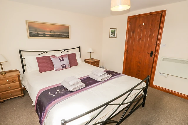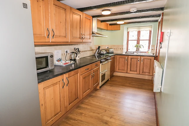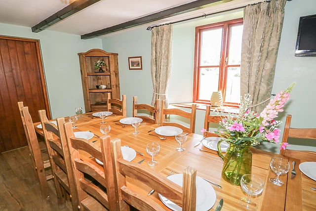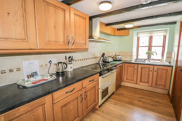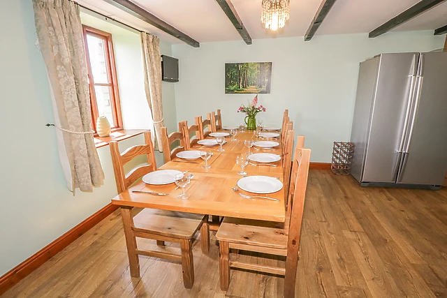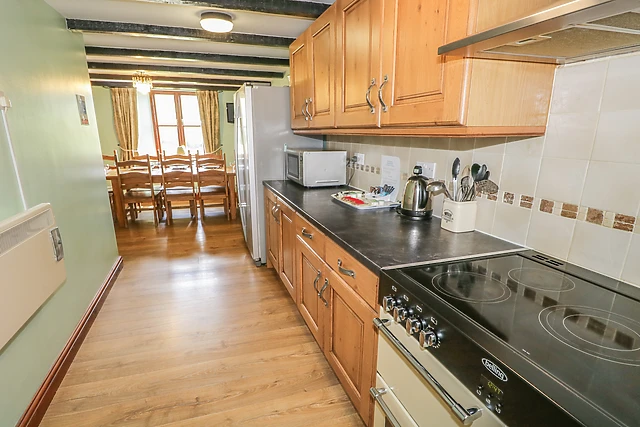 Walking through into the L-shaped kitchen/diner, there's a lovely country cottage feel and a substantial dining table with seating for 10. From here the stairs split with stairs leading down to the lower ground floor where you'll find 2 double bedrooms (one with a king size bed, sofa and TV) both with character beams, plus a bathroom with separate shower cubicle, basin and WC and a utility room with a washing machine and tumble dryer.