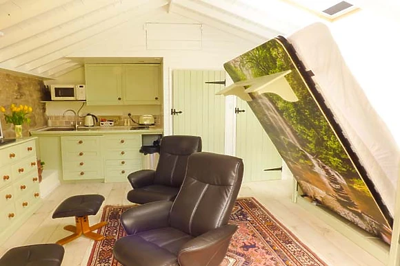 Small and compact, this creatively designed studio has a pull down king-size bed, which fits neatly into a feature wall. There is a cosy kitchen area, with bespoke hand-built painted cupboards and fold-away dining table, whilst two comfortable leather chairs provide relaxed viewing of the Smart TV.