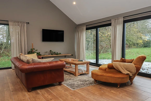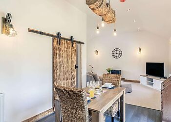 The cottage boasts a beautifully-appointed open-plan living space with a fully-equipped kitchen, dining area, and cosy sitting area, complete with plush seating and a TV for intimate evenings in.