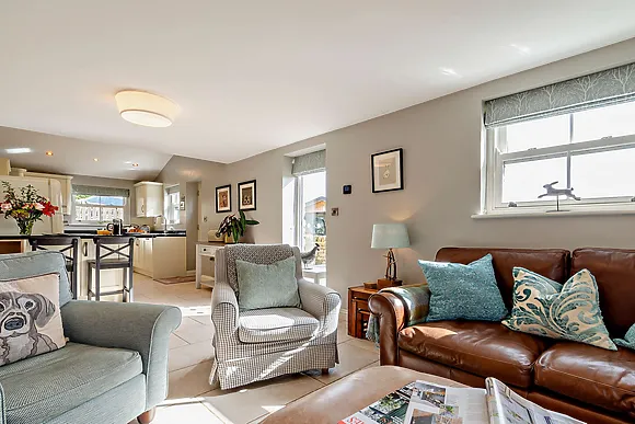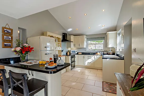 The property features heated limestone flooring and an open fire or woodburner, creating a warm and cosy atmosphere throughout your stay.