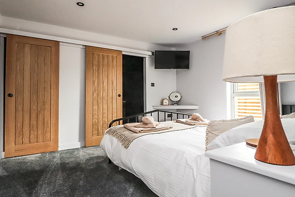 The cottage's open-plan living space is a testament to modern living, with a well-equipped kitchen and a vast sitting area with a Smart TV for entertainment.