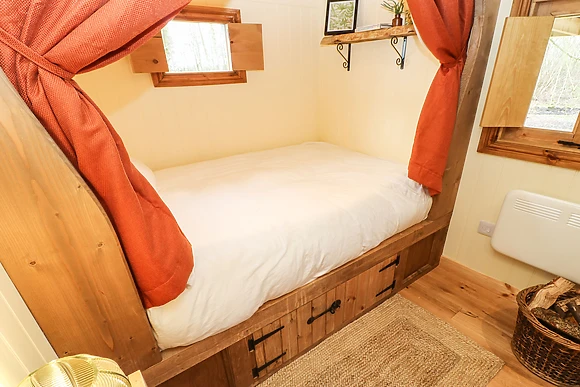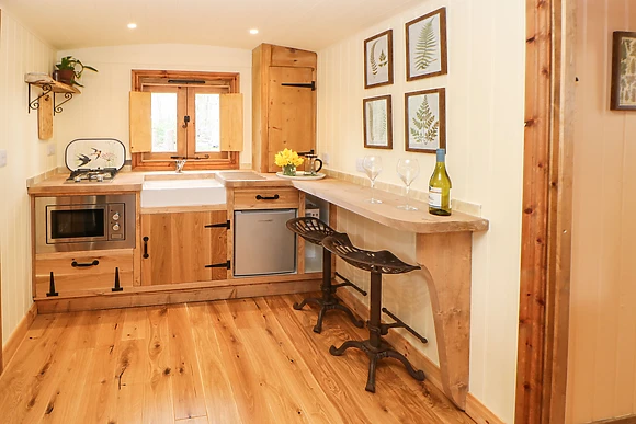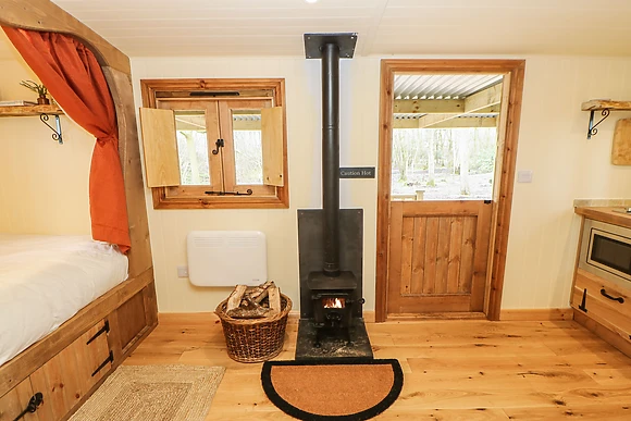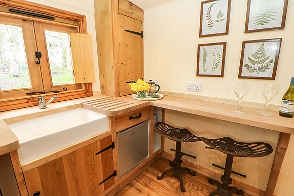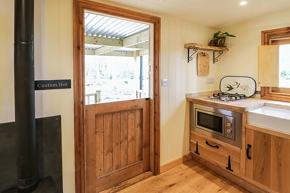 Accommodating two guests, this single-storey, studio-style shepherd's hut offers a cosy double bed, kitchenette, and a sitting area warmed by a woodburning stove.