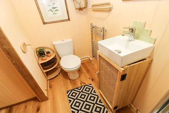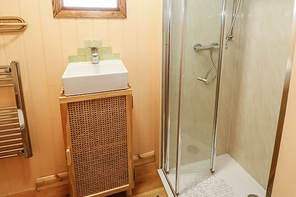 The modern shower room adds a splash of comfort to your rustic escape.