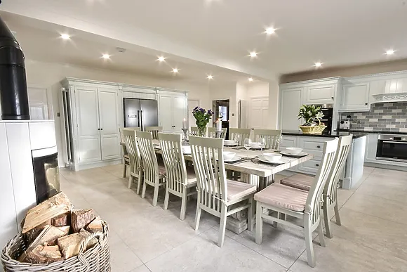Indulge in the lavish interiors, from the sumptuous sitting room with its open fire to the grand farmhouse kitchen, complete with a wood burning stove and polished granite worktops.
