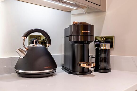 The kitchen is generously equipped with an induction hob, electric oven, fridge, freezer, wine cooler, dishwasher, washing machine, Nespresso machine, and microwave, catering to all your culinary needs.