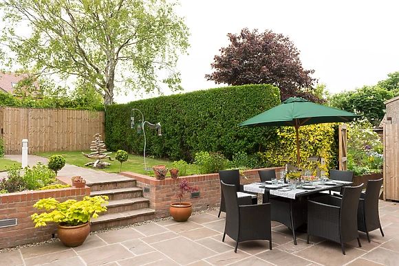 The cottage features a beautiful garden and patio area, ideal for alfresco dining or simply enjoying the serene surroundings.