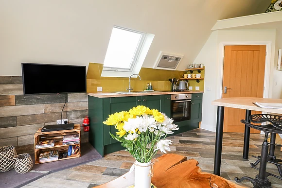 The accommodation is equipped with electric central heating and a log burner, ensuring a warm and cosy stay regardless of the weather.