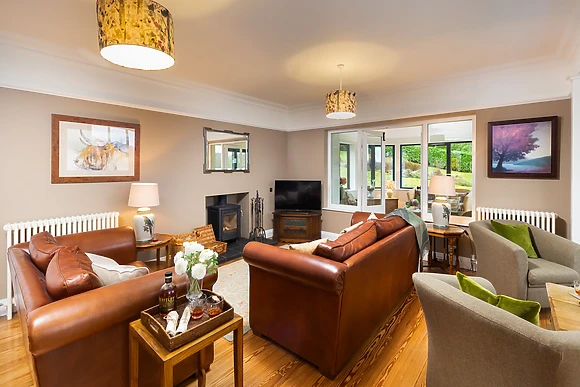 Indulge in the comfort of the spacious living areas, including a sitting room with a woodburning stove and a conservatory leading out to a sun terrace.