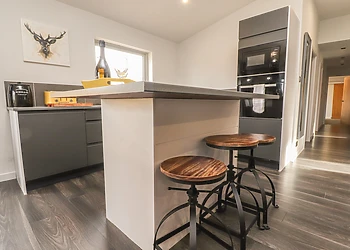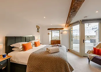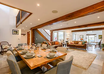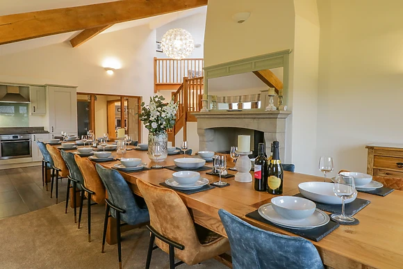 A separate dining room is large enough to hold dinner parties for all guests, featuring a woodburning stove for colder nights, whilst you catch up on the day's adventures at the spacious dining table. Another well-equipped kitchen/diner sits separate from the main barn, ideal for families or smaller groups wanting to prepare their own meals and have some private time from the main building.