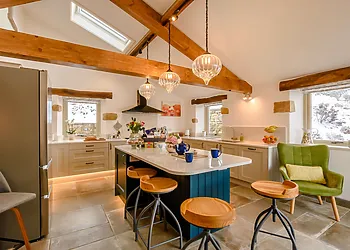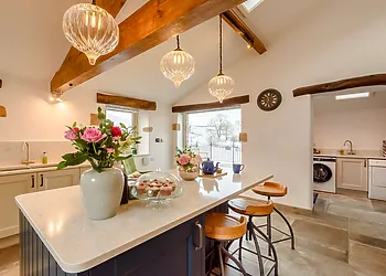 Every care has been taken by the owners to produce a first-class holiday home; this Ingleton barn conversion features high quality fixtures and fittings, exposed oak beams throughout and lovely views across the river. An open-plan living space offers a farmhouse-style kitchen with fantastic amenities to prepare home-cooked dinners and hearty breakfasts, combined with a contemporary sitting room where a woodburning stove sets the scene for a warm, peaceful evening in front of the TV.