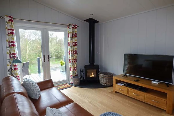 On entering the lodge there is a vestibule with seating area and the washer/dryer which leads into the open plan living space with a large comfortable leather settee and woodburner, perfect to relax in front of on those chillier evenings. When warmer, open the patio doors and step onto the decking perhaps for an alfresco meal or drink and listen to the sound of bird song.