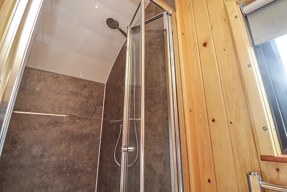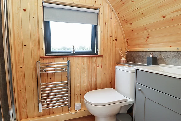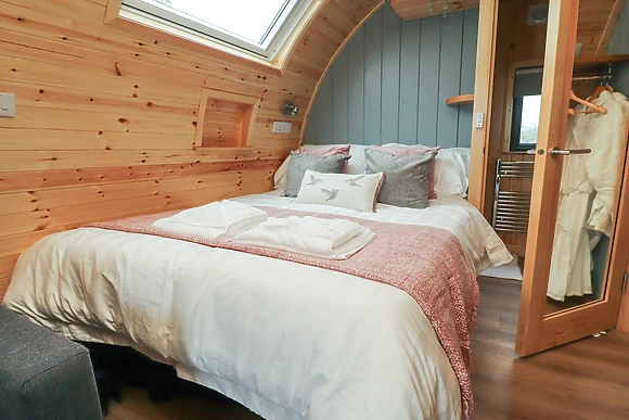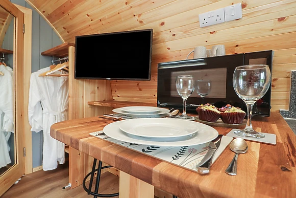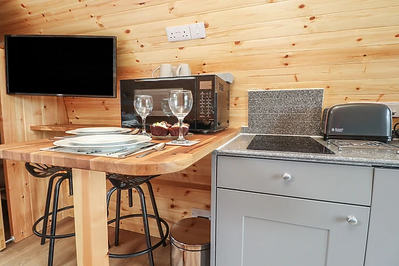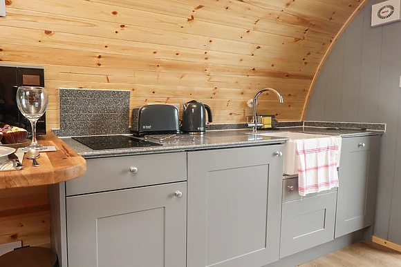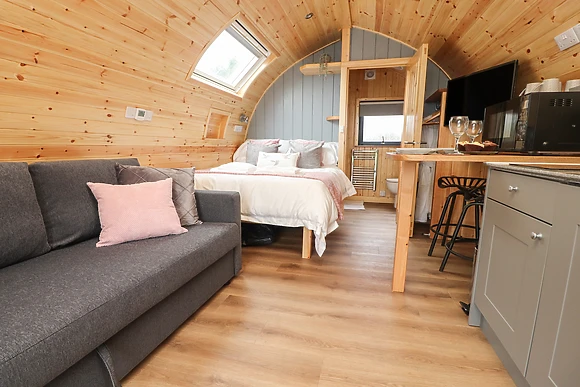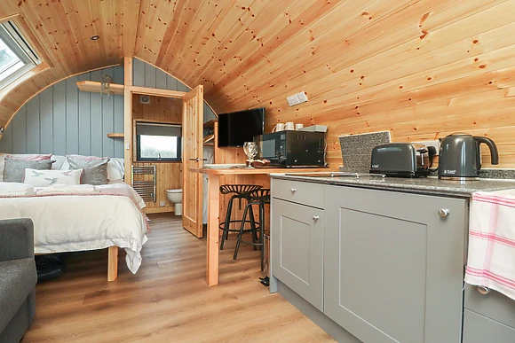 The pod is fully equipped with modern amenities, including a kitchenette for convenient meal preparation, a plush double bed, and a sleek shower room.