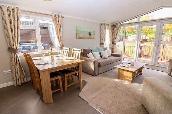 Upon entering this single-storey lodge, you will be greeted by a spacious open-plan area, thoughtfully designed to cater to all your needs. The kitchen is well-equipped, ready for you to prepare your favourite meals, which can be enjoyed at the dining table set for four.