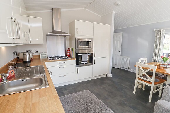 The lodge features two cosy bedrooms, one double with an en-suite shower room and one twin, ensuring a restful night's sleep for all. The open-plan living space, complete with a gas fire, provides a warm and inviting atmosphere where you can unwind and create cherished memories.