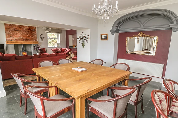 A large modern, open plan kitchen with wall mounted flat screen TV and a lovely seating area with cosy wood-burning stove, feature fireplace and patio doors provide another great place to sit and talk about your day and to prepare a family dinner. The main dining area overlooks the mature garden area and also provides small secluded seating areas to get away from it all and catch up with an old friend or family member.