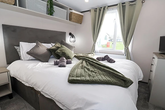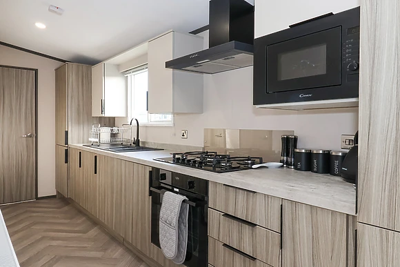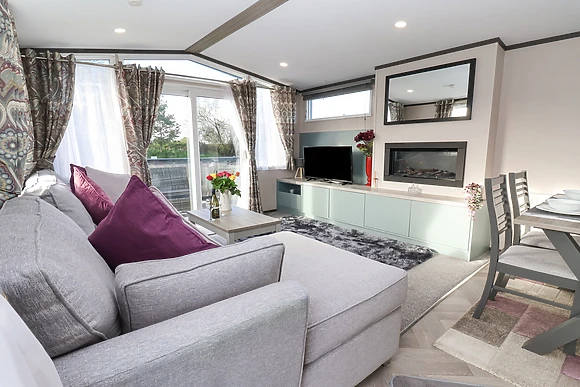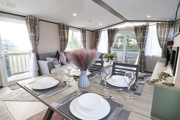 Park up outside or take advantage of the additional parking area, before ascending the external steps to reach your decked space, designed with alfresco dining and relaxing in mind. Be impressed by the open-plan living space, where you can prepare meals in the sleek kitchen, gather as a four around the dining table, and lounge upon the corner sofa, with an electric fire for added warmth.