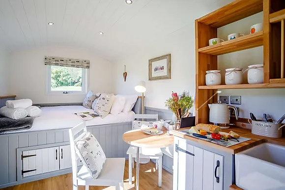 Take two steps up to discover your unique, bijou shepherd s hut accommodation. Return from long hikes to enjoy a hot shower before unwinding in front of the Smart TV or with your holiday novel.