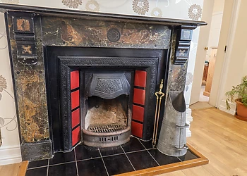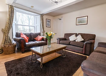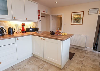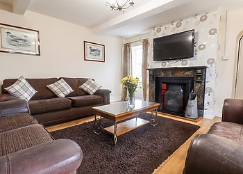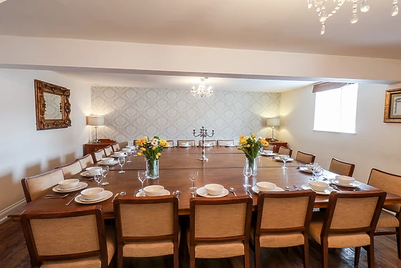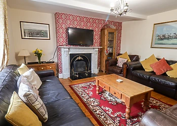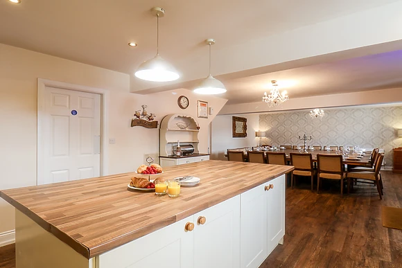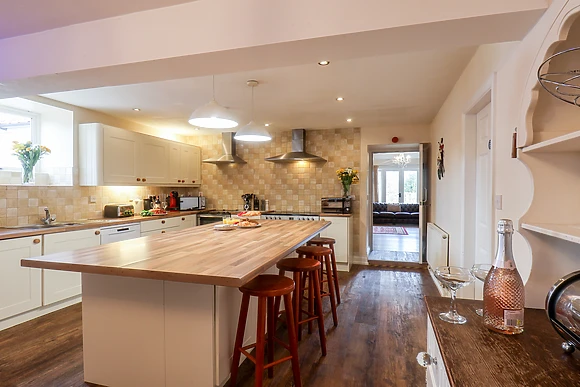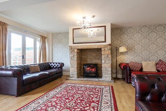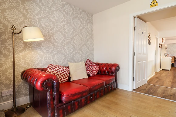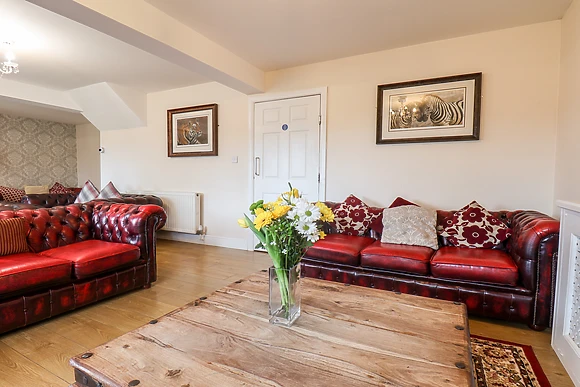 Be welcomed into this large property and discover a spacious kitchen/diner with ample amenities to cater to your culinary needs, as well as a large dining table to seat up to twenty-two guests. The sitting room enjoys the ambience of an electric stove, as well as stylish red leather sofas and TV, ideal for guests to relax in after a long day of exploring.