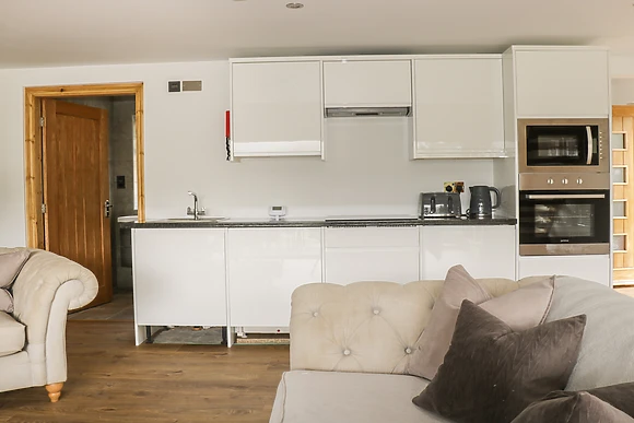 Aside from the king-size mezzanine bedroom, the accommodation offers a small folding double bed and a sofa bed to accommodate additional guests if required.