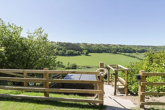 The lodge boasts a luxurious hot tub, where you can unwind and soak in the stunning views of the surrounding sheep-filled fields.