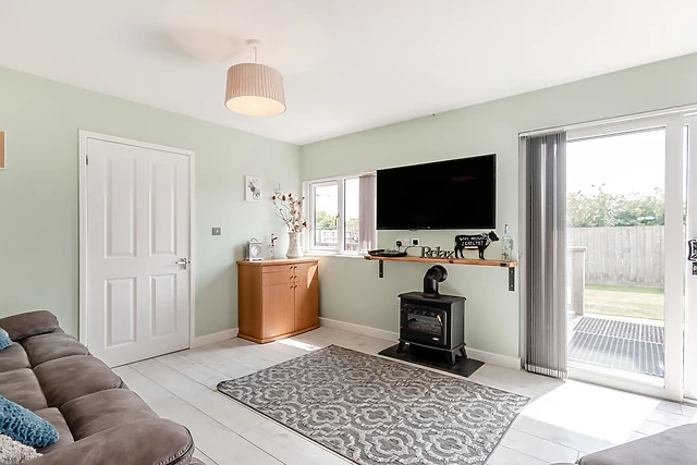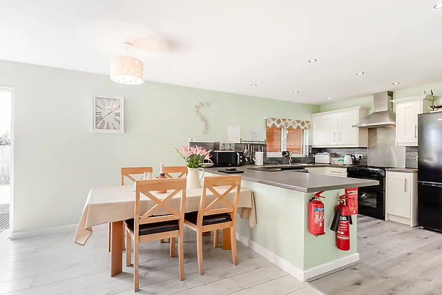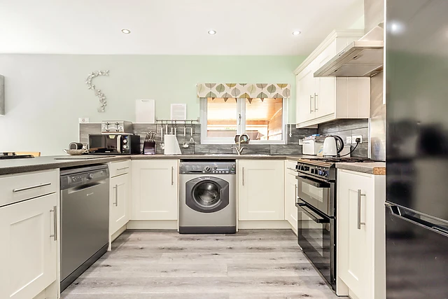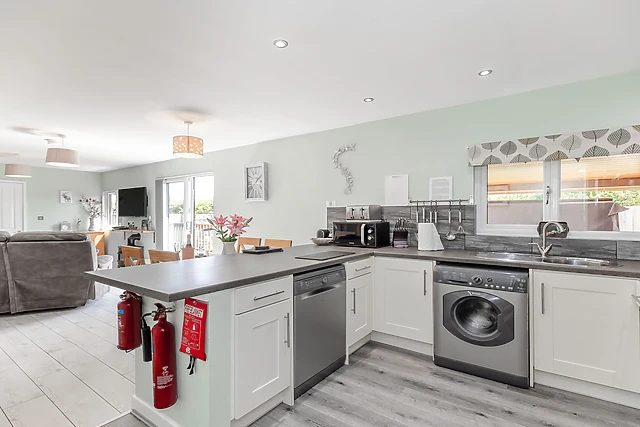 The second bedroom offers a luxurious super king-size bed cleverly converting to two full-size single beds. This fabulous lodge has an open plan living space ideal for keeping the cook company!