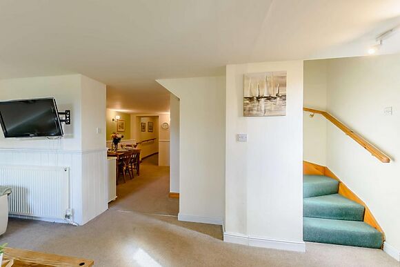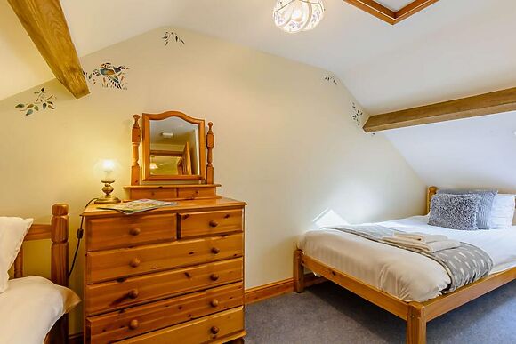 The cottage features three bedrooms, including a convenient ground-floor twin room and an additional double and twin room upstairs, ensuring comfortable accommodation for all.