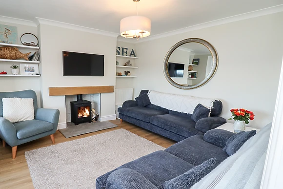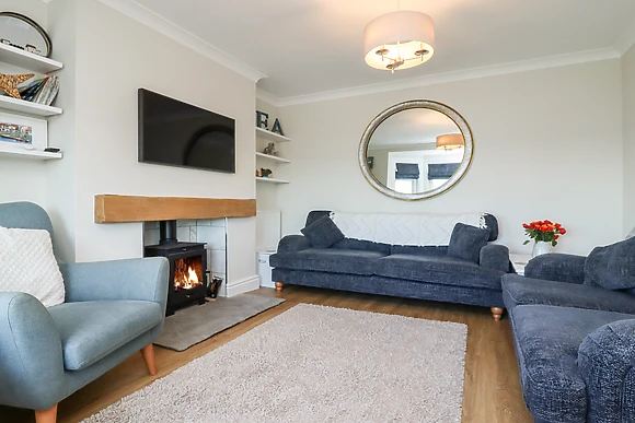 Indulge in the comfort of this double-fronted brick villa, where a woodburning stove adds a cosy touch to the stylish sitting room.