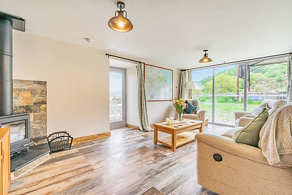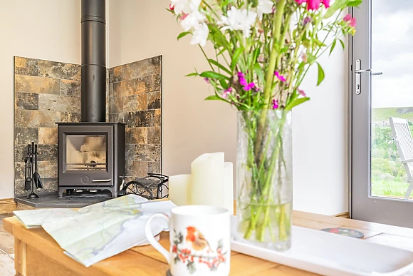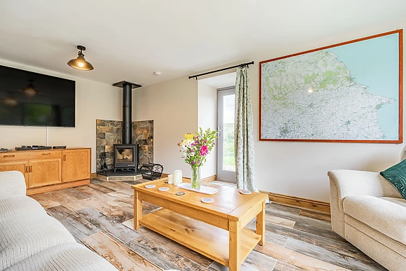 The cottage features underfloor heating for a cosy experience, complemented by a woodburning stove in the sitting room for added warmth and ambiance.