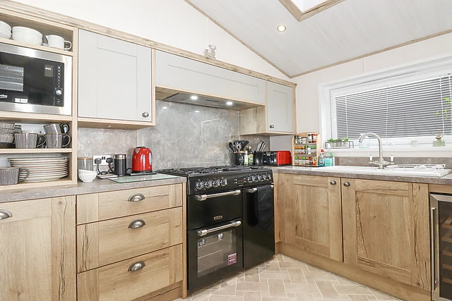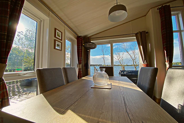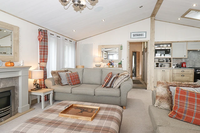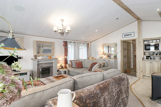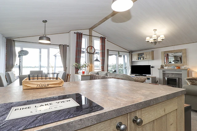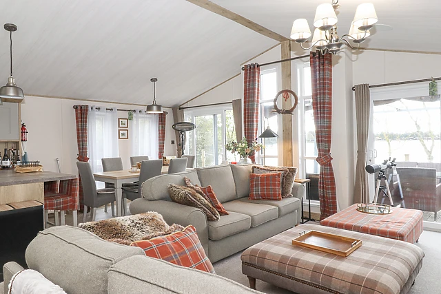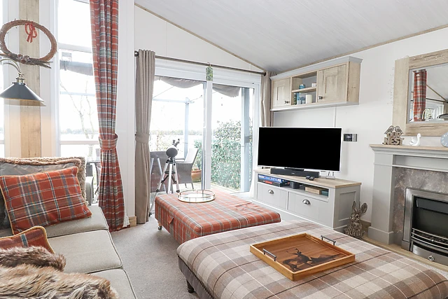 Be welcomed into a high-quality lodge, boasting a superb lakeside location and stylish soft furnishings adding an air of opulence to your stay, with triple aspect floor-to-ceiling windows drawing in seas of natural light. The living space is open plan, offering a sitting area where you can warm your feet beside the electric fire, before making the most of the amply fitted kitchen, cooking up a storm and enjoying your meal at the dining table, and there are many wonderful features throughout this social hub, including a Smart TV and telescope.