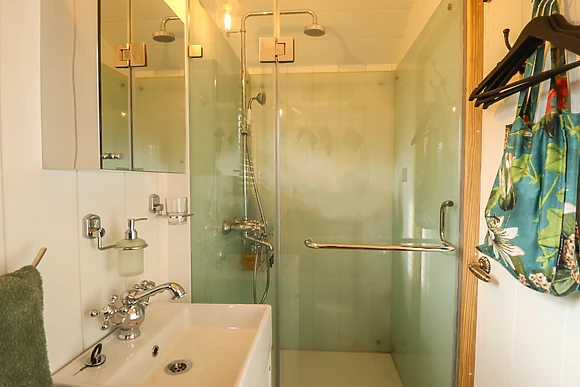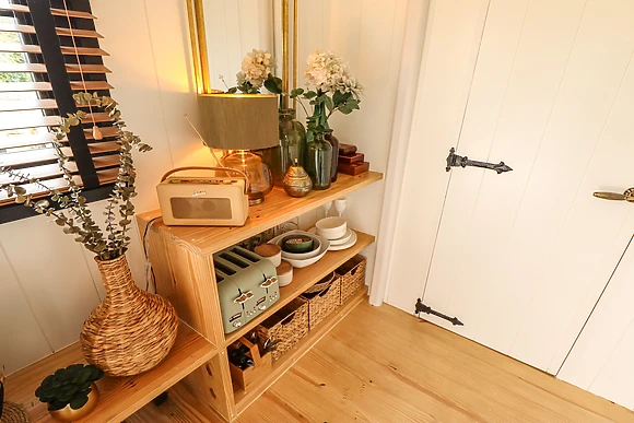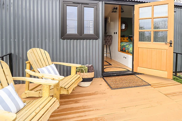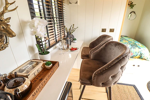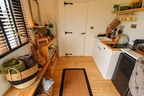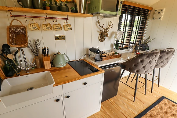 Climb up to your stylish shepherds hut to find a compact, studio-style living space with a luxury double bed that you'll sink into for a great night's sleep. The kitchenette is equipped with everything you need for you to whip up delicious meals to enjoy at the breakfast bar or out on the elevated deck overlooking wonerful views.