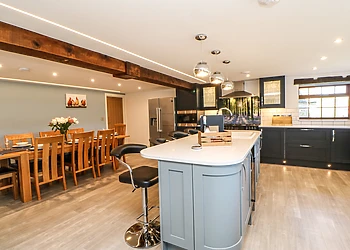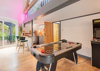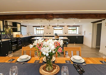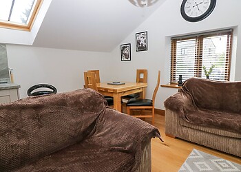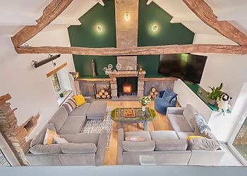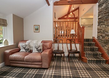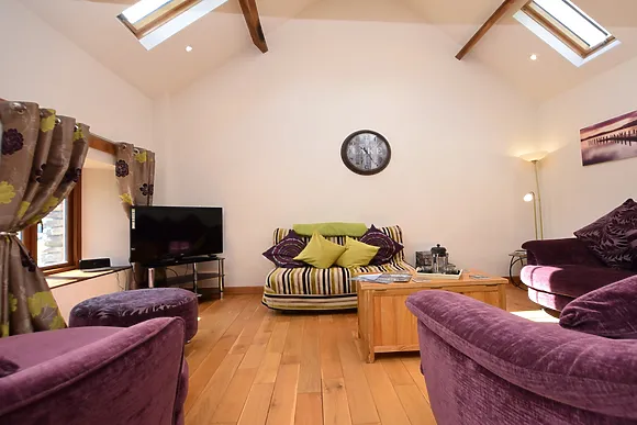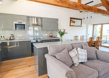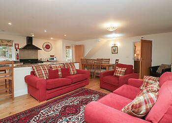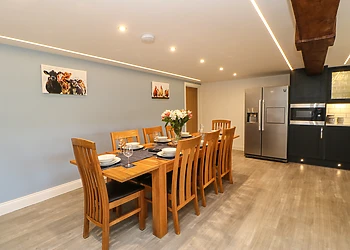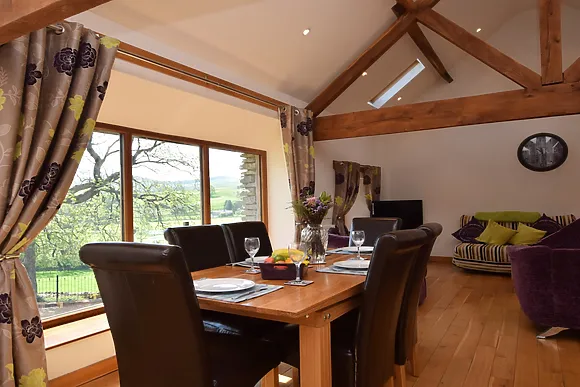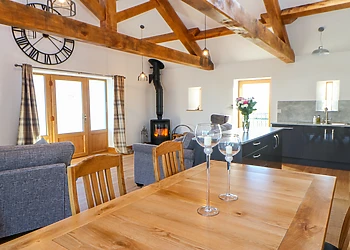 Indulge in the comfort of the open-plan lounge/kitchen/diner, boasting vaulted ceilings and original wooden beams. The lounge, with its plush sofas, is ideal for unwinding with a film, while the dining area offers magnificent views through a large picture window.