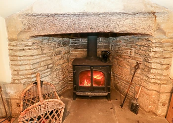 The heart of the home is the open-plan living space, complete with a wood-burning stove and a well-equipped kitchen.
