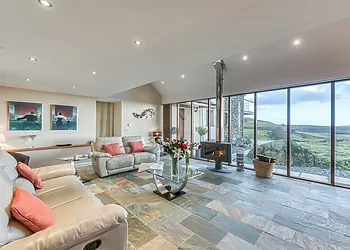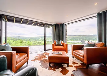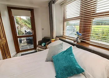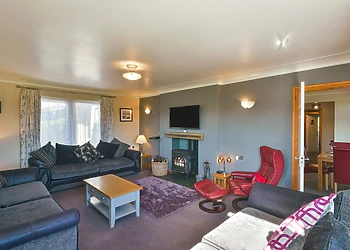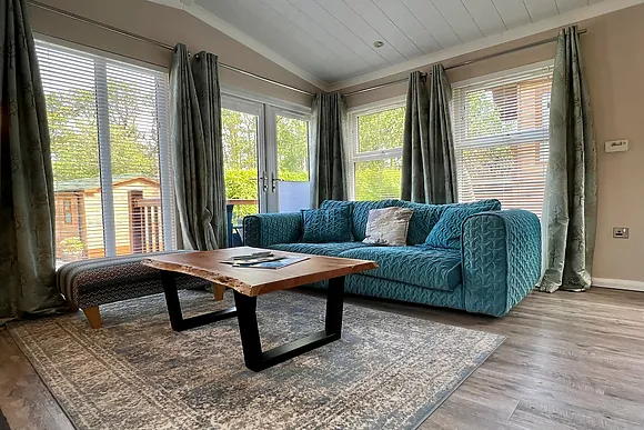 The lounge, complete with a wood burner effect electric fire, opens onto a decked balcony, inviting you to bask in the tranquil surroundings.