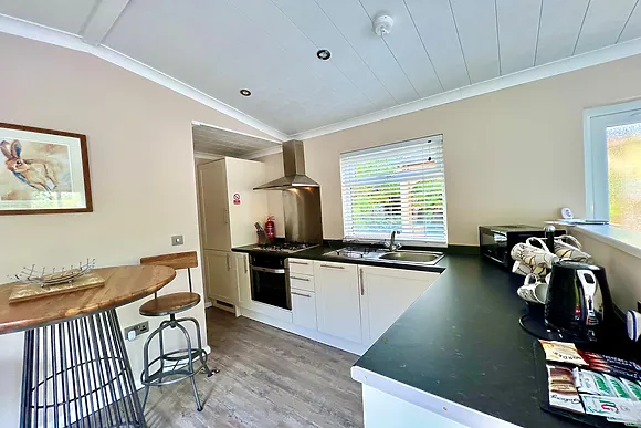 The lodge offers a cosy double bedroom, a stylish en-suite shower room, and an open-plan living space that includes a well-equipped kitchen, perfect for culinary exploits.