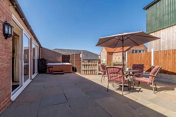 Patio doors lead to a private patio with BBQ facilities, ideal for al fresco dining.