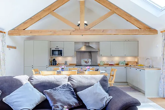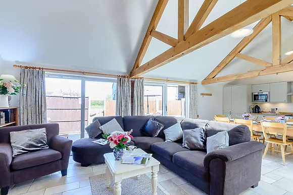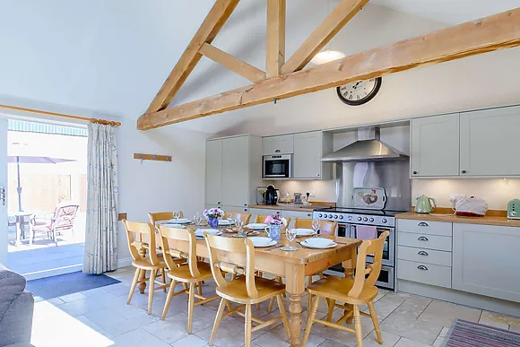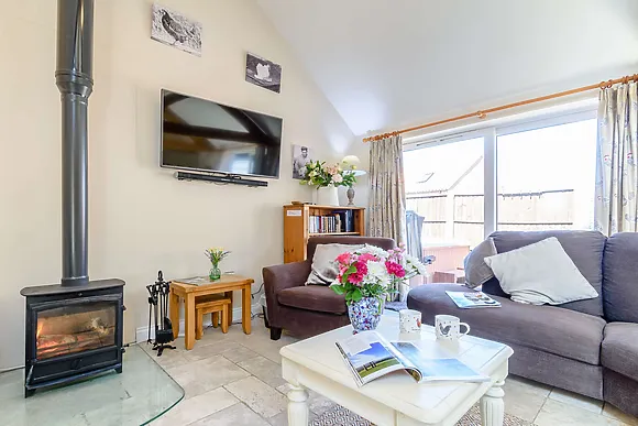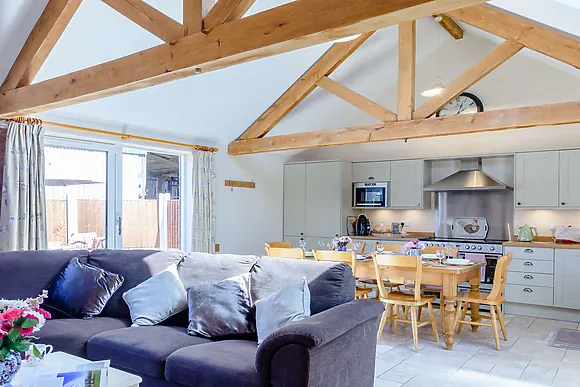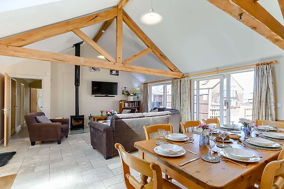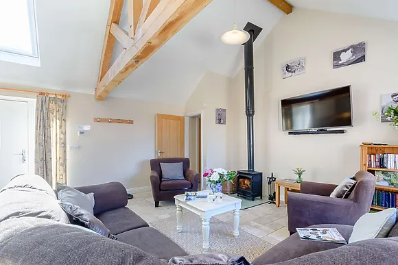 Step into the open-plan living space, where high beamed ceilings and a wood burner create an inviting atmosphere. The kitchen is fully equipped for culinary adventures, and the lounge area, complete with TV/DVD, is perfect for unwinding.