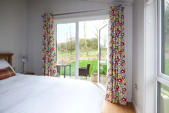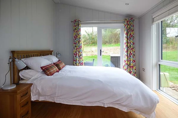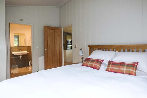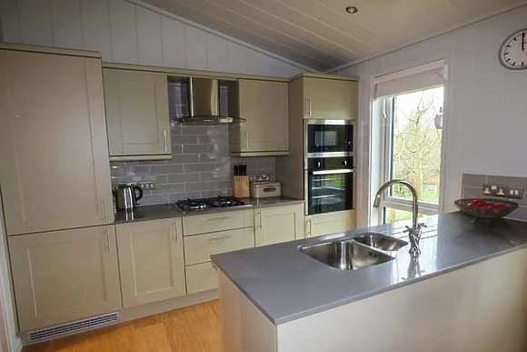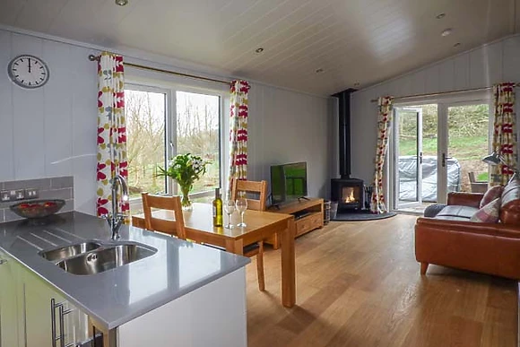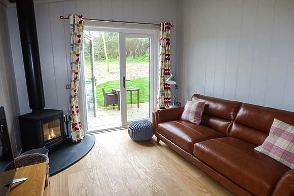 On entering the lodge there is a vestibule with seating area and the washer/dryer which leads into the open plan living space with a large comfortable leather settee and woodburner, perfect to relax in front of on those chillier evenings. When warmer, open the patio doors and step onto the decking perhaps for an alfresco meal or drink and listen to the sound of bird song.