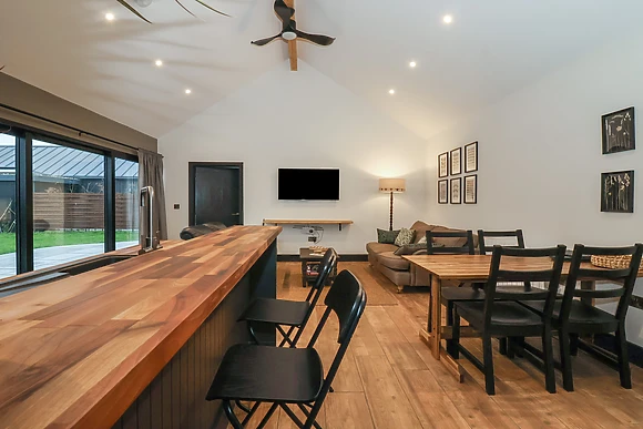 The open-plan living area, complete with a kitchen, dining space, and sitting area, is ideal for social evenings or quiet nights in.