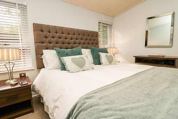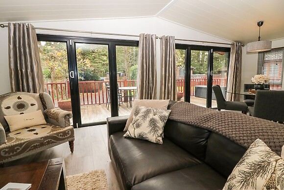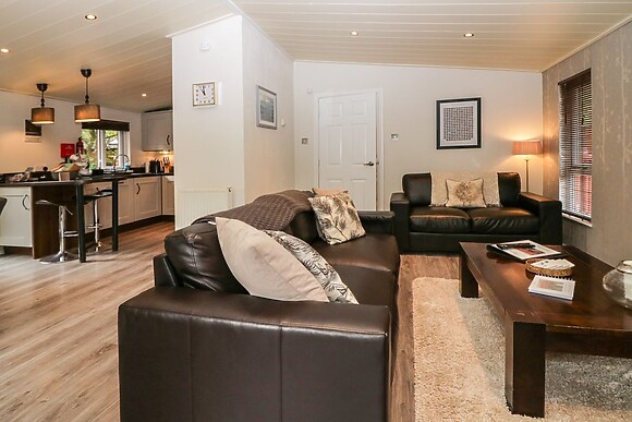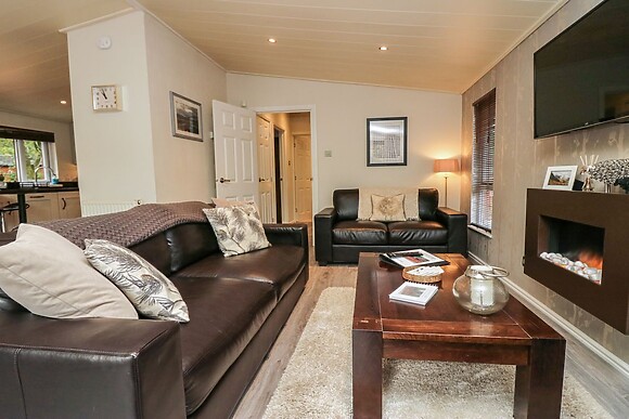 Somerford Lodge is a delightful contemporary, two-bedroom lodge, set in a wooded cul-de-sac at White Cross Bay Holiday Park. Somerford Lodge has a spacious open-plan living, dining, and kitchen area, with two leather sofas, an armchair, a coffee table, and an electric fire, along with a Smart TV and Smart speaker.