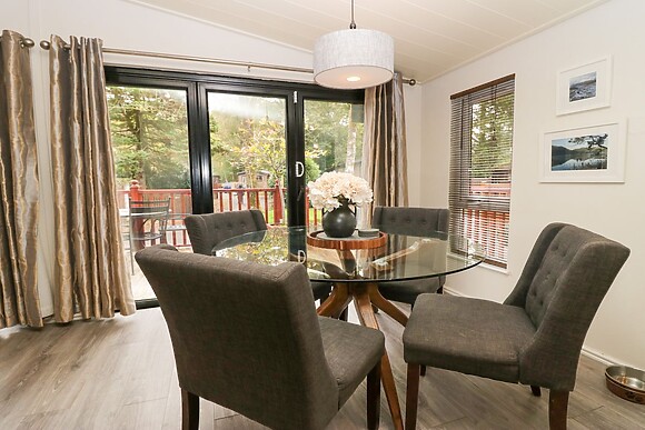 The dining area has a round glass table and four chairs to savour hearty meals. The lodge also has double bi-fold doors giving a light and bright interior – perfect for those glorious warm evenings!