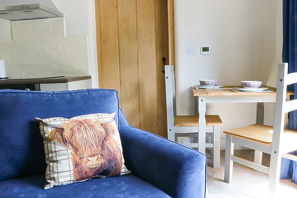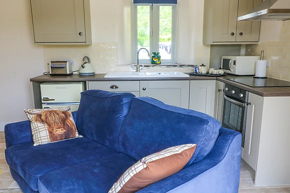 Small and cosy throughout, the open-plan living area contains a modern and well-equipped kitchen, a dining and sitting area and a lovely woodburning stove. Doors provide access to the patio area and the lovely views down to the river and the fells beyond.