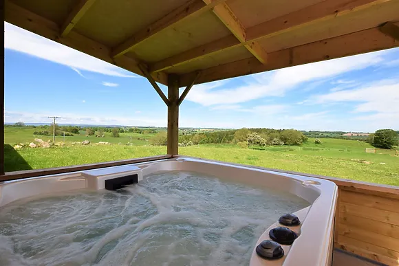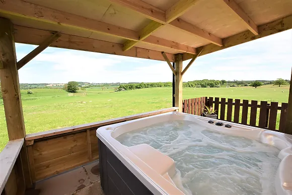 Yes, the accommodation features a private hot tub, offering a luxurious spot to relax and enjoy the sweeping views of the surrounding farmland.