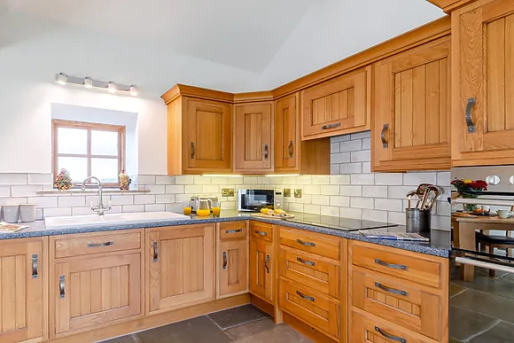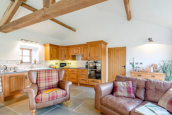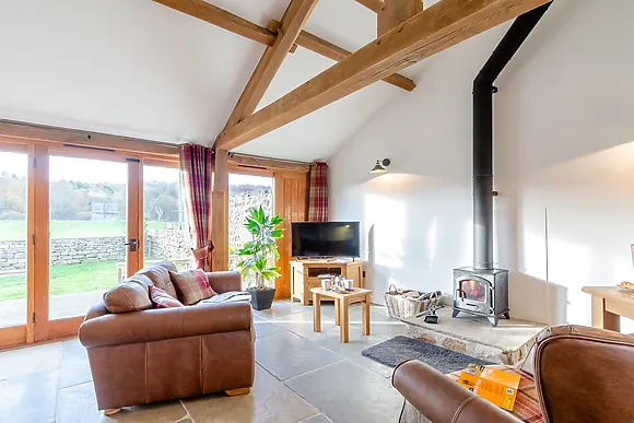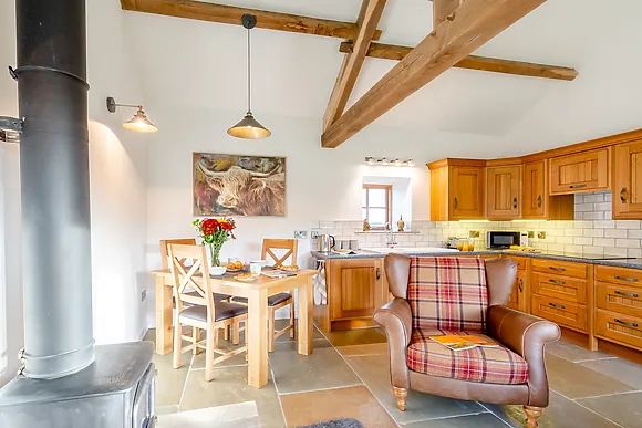 Relax in the open-plan living space, complete with a cosy wood burner, Smart TV, and a well-equipped kitchen for those intimate home-cooked meals.