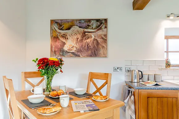 The cottage comes with a fully equipped kitchen, including an electric oven and hob, dishwasher, fridge, washing machine, and even a slow cooker for your culinary needs.