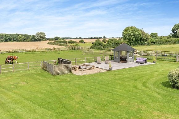 Offering a real farmhouse feel with exposed beams and high vaulted ceilings, you will find it hard to tear yourself away from the luxury of this property. Inside, glass partitions offer a view sweeping right across the open-plan living room.