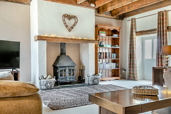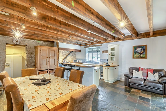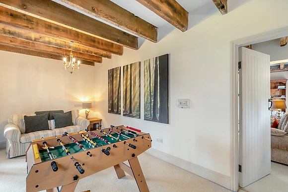 The spacious sitting room offers warm colours and cosy evenings by the fire, whilst the games room next door has football table for those feeling competitive. Across the hallway, gather for meals around the dining table and relax on the sofa after an adventurous day out.