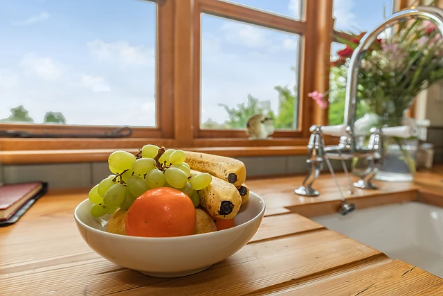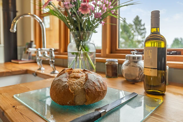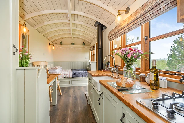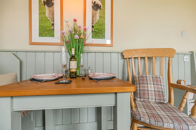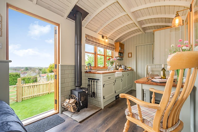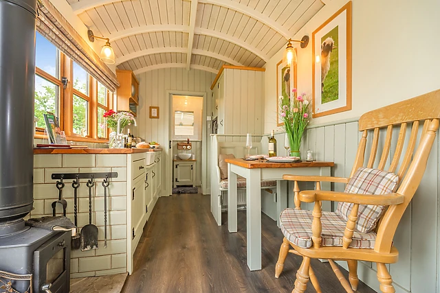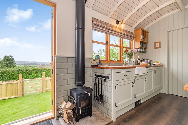 The open-plan layout comprises of a double bedroom, with a central kitchen/diner looking out over the wonderful landscape. After a cosy meal at the dining table, you can snuggle up in bed, while still enjoying the warm ambience from the woodburning stove or the thermostatically controlled radiators.
