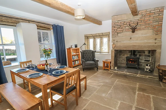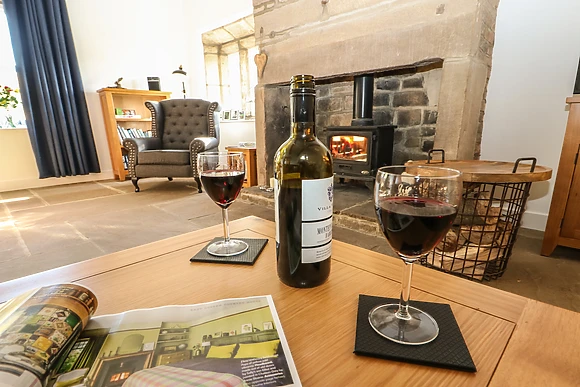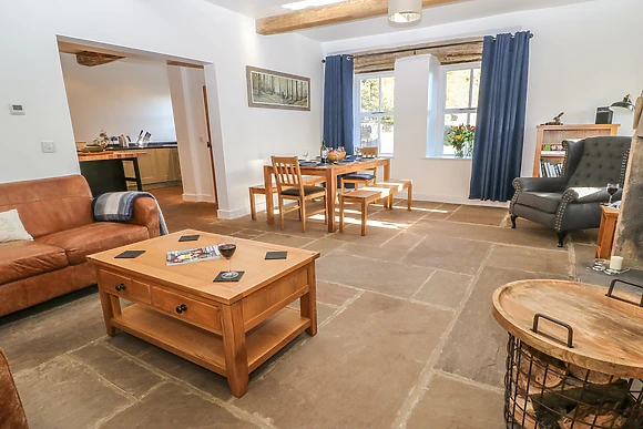 Retaining some of its original features, inside you will find a luxurious open-plan living room with exposed beams and underfloor heating. The sitting room boasts a charming woodburner set within the inglenook, and mullioned windows are filled with green landscape scenery from outside.